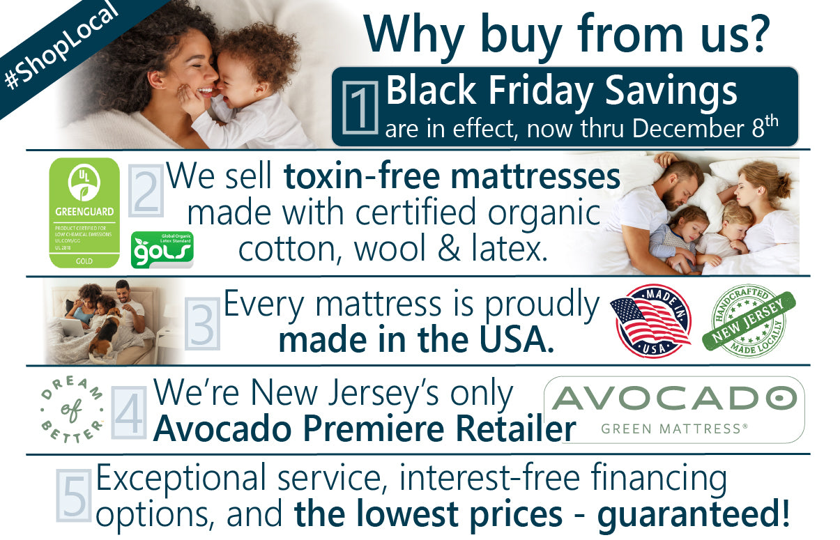 We're also the only locally-owned sleep shop in northern New Jersey offering our own collection of certified natural & organic mattresses made right here in New Jersey.