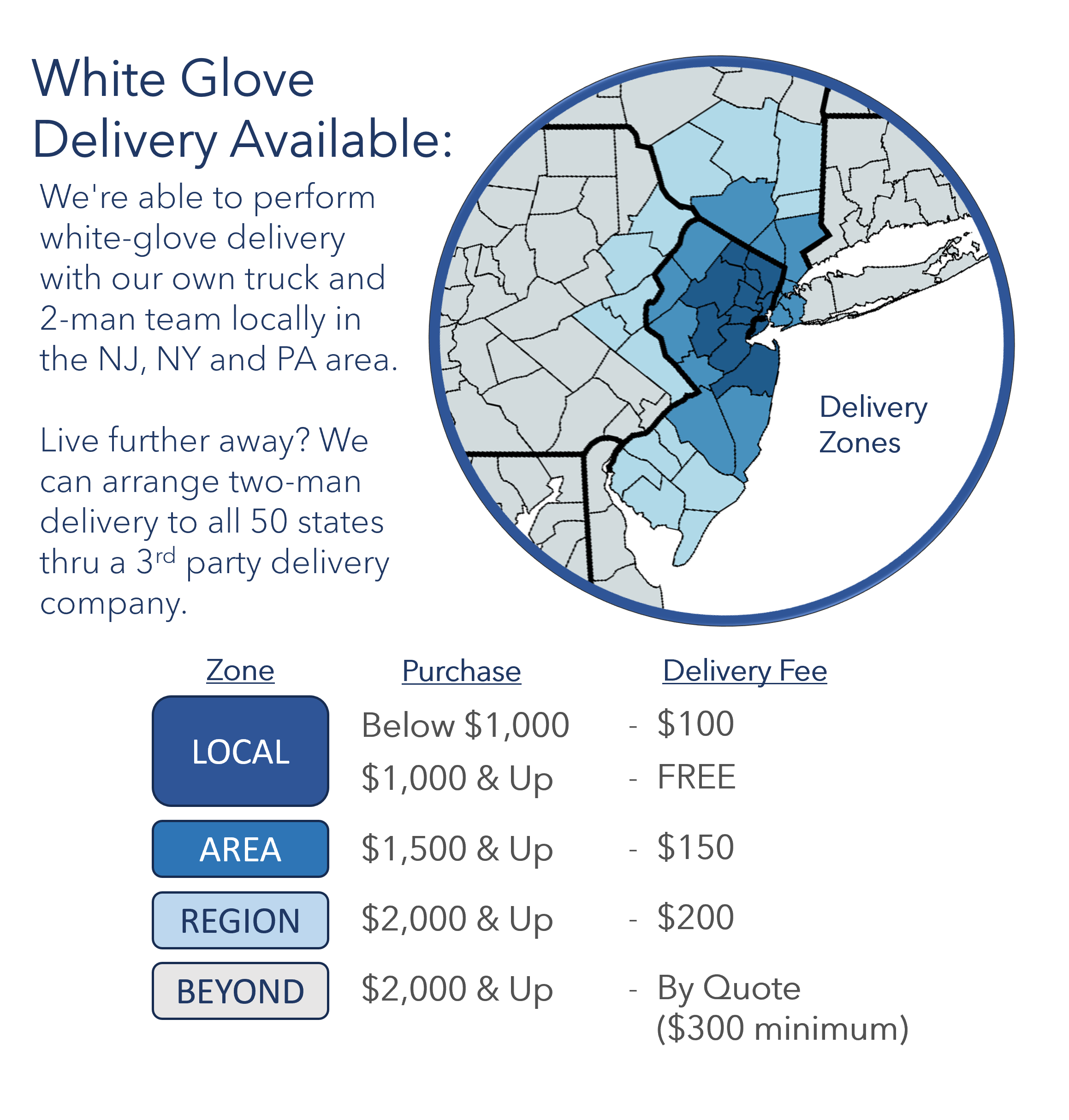 White Glove Delivery - provided for FREE in our local New Jersey delivery area. Also available nationwide w/ delivery quote.